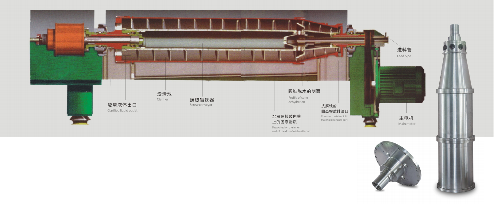 The drum of this machine is driven by the main motor.The frequency conversion motor and the gear box (or hydraulic motor)form the differential system between the drum and the spiral.The drum and the spiral rotate at the same axis at different speeds in the same direction.The feed pipe enters the drum through the spiral discharge port.Under the action of high-speed rotating centrifugal force,the solid particles with larger specific gravity settle to the inner wall of the drum.The solid particles are scraped off and pushed towards the small end of the drum and discharged from the slag discharge port.The liquid phase with a smaller specific gravity forms an inner liquid ring in the drum,which is continuously clarified along the spiral groove and flows to the big end of the drum.The overflow weir plate with adjustable caliber overflows,thus realizing the separation of solid-liquid two-phase or three-phase.The rotating speed of the drum,the differential speed between the drum and the spiral can be adjusted steplessly according to the characteristics of the separated material.