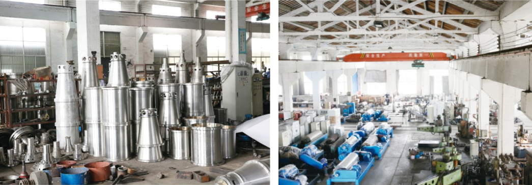 该机转鼓由主电机带动,变频电机和齿轮箱(或液压马达)构成转鼓和螺旋之间差速系统,转鼓和螺旋在同一轴线以不同转速同向旋转,悬浮液通过固定的进料管,经螺旋出料口进入转鼓,在高速旋转的离心力作用下,比重较大的固相颗粒沉降到转鼓内壁,在螺旋差速的作用下,不断将沉降在转鼓内壁上的固相颗粒刮下并推向转鼓小端,从排渣口排出,比重较小的液相在转鼓内形成内层液环,沿螺旋槽不断被澄清,且流向转鼓大端,从口径可调的溢流堰板口溢出,从而实现了固液二相或三相分离。转鼓转速、转鼓和螺旋之间的差速,根据分离物料特性进行无级可调。