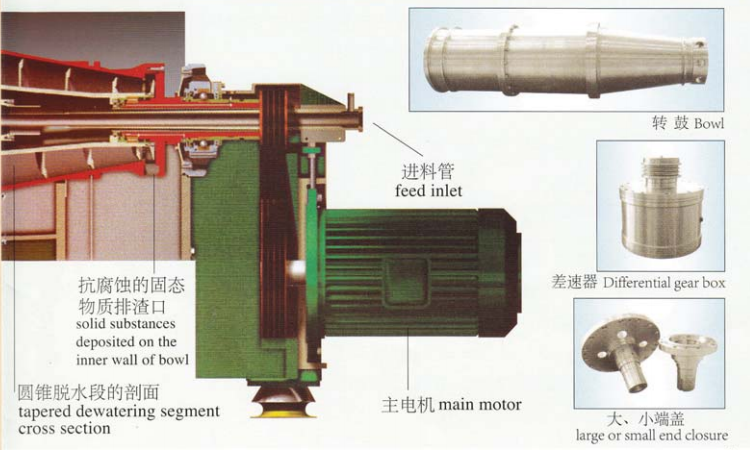 The drum of this machine is driven by the main motor, and the variable frequency auxiliary motor and the gearbox (or hydraulic motor) form a differential system between the drum and the screw. The drum and the screw rotate in the same direction at different speeds on the same axis. The suspension enters the drum through the fixed feeding pipe and the discharge port of the screw. Under the action of the centrifugal force of high-speed rotation, the solid particles with a larger specific gravity settle on the inner wall of the drum. Under the action of the spiral differential speed, the solid particles that have settled on the inner wall of the drum are continuously scraped off and pushed towards the small end of the drum, and discharged from the slag discharge port. The liquid phase with a lower specific gravity forms an inner liquid ring inside the drum and is continuously clarified along the spiral groove towards the large end of the drum, overflowing from the adjustable diameter overflow weir plate opening, thus achieving the separation of solid-liquid two-phase or three-phase. The rotational speed of the drum and the differential speed between the drum and the screw can be adjusted steplessly according to the characteristics of the separated materials.